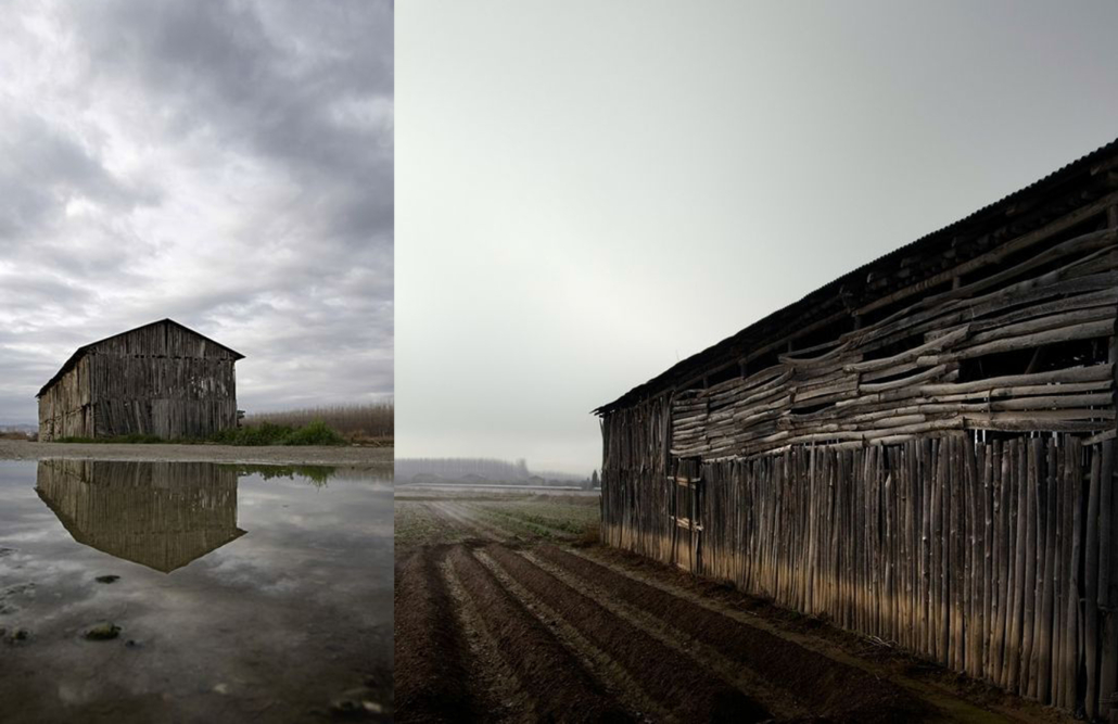 The traditional drying sheds, built from wooden slats that allowed ventilation for tobacco or corn, are essential structures of this agricultural landscape. Their simple forms—prismatic volumes, walls textured with vertical wooden strips, sloped roofs—constitute an anonymous architecture deeply linked to Granada’s agricultural history.
