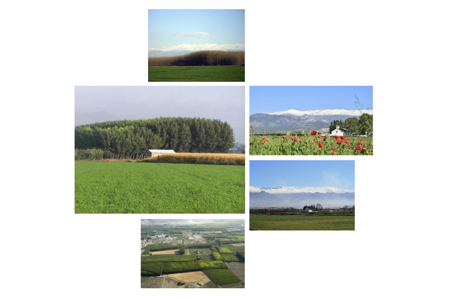 The images of the Vega of Granada—green fields of alfalfa, poplar groves framing the horizon, clear skies, and Sierra Nevada in the background—depict a landscape that has served as the economic, identity-based, and aesthetic foundation of the city for centuries. But the Vega is not only geography: it is architecture.